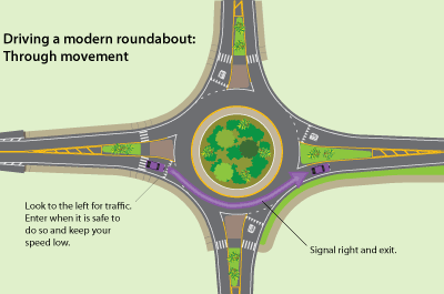 - Yield to traffic in the roundabout - Vehicles and pedestrians in the roundabout have the right-of-way