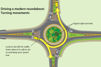 - Yield to traffic in the roundabout - Vehicles and pedestrians in the roundabout have the right-of-way